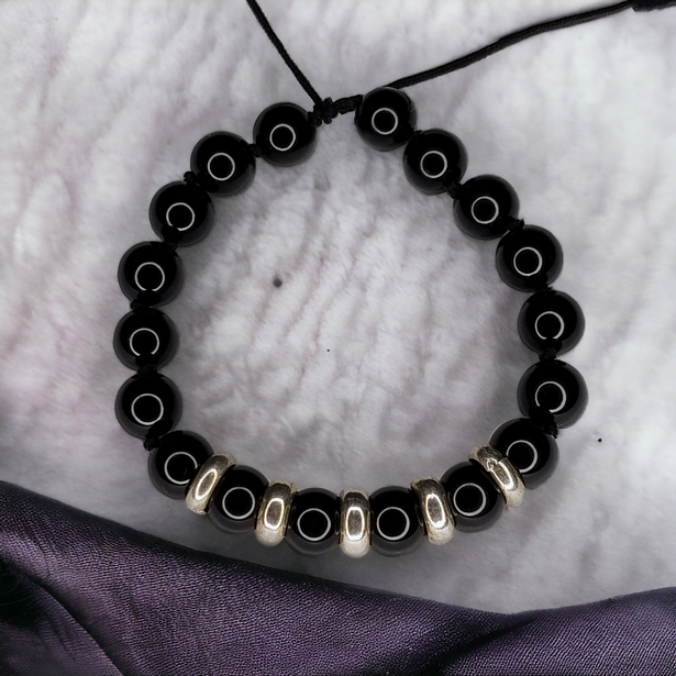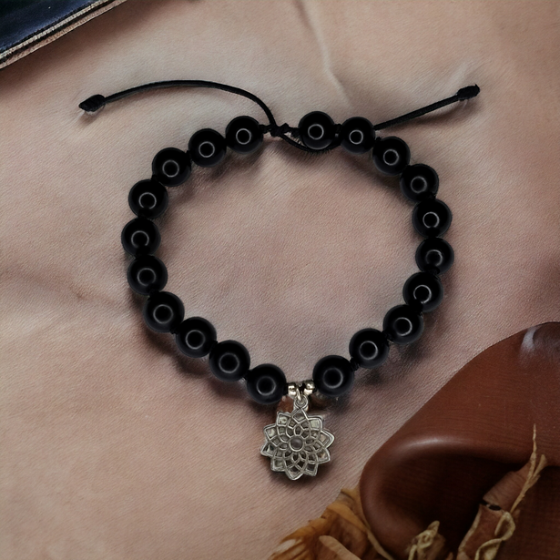 Brazalete elaborado en Cuentas de onix con dije de flor de la vida de plata 950.