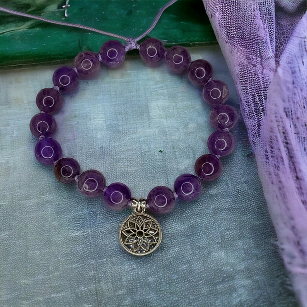 Brazalete elaborado en Cuentas de AMatista con dije de flor de la vida de plata 950.