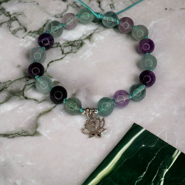Brazalete elaborado en Cuentas de fluorita con dije de flor de la loto de plata 950.