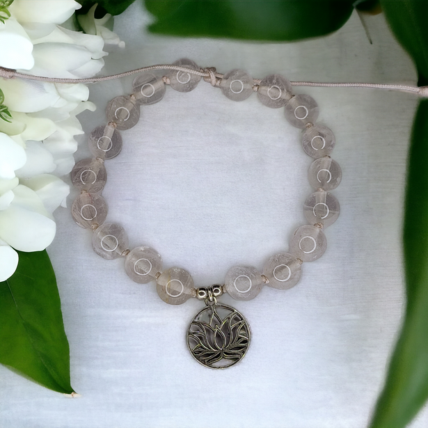 Brazalete elaborado en Cuentas de cuarzo rosa con dije de flor de loto de plata 950.