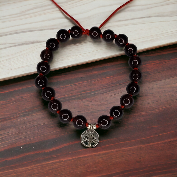 Brazalete elaborado en Cuentas de granate con dije de arbol de la vida de plata 950.