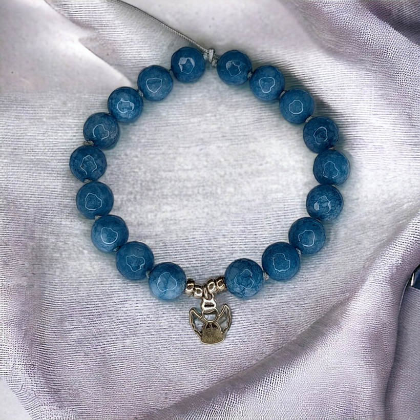 Brazalete elaborado en Cuentas de larimar con dije de angel en Plata 950.